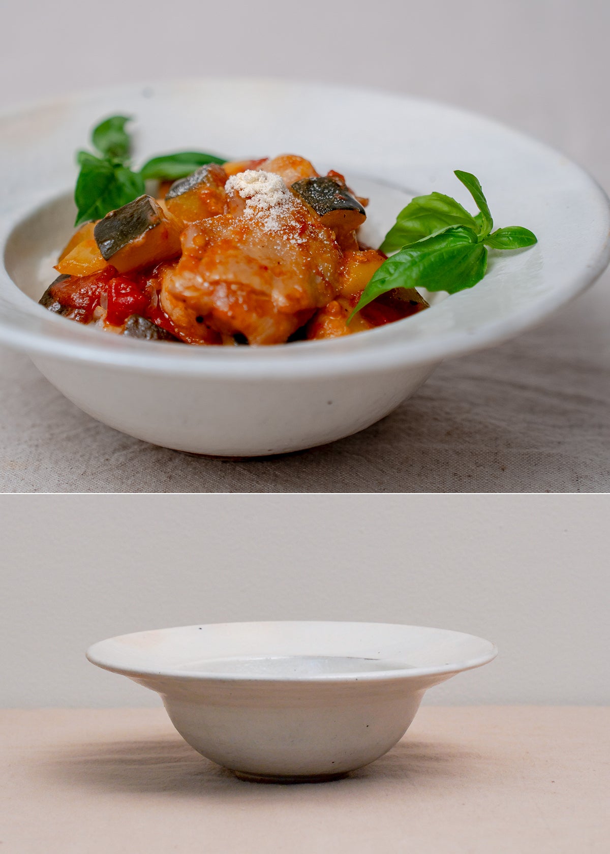「古谷浩一さんの器の魅力は、包容力があるところ。今回は丼がテーマでしたが、あえてリム付きの器を選んでみました。粉引の魅力を活かして赤が効いた夏らしい洋風丼に。日々のおばんざいとも相性抜群ですよ。」